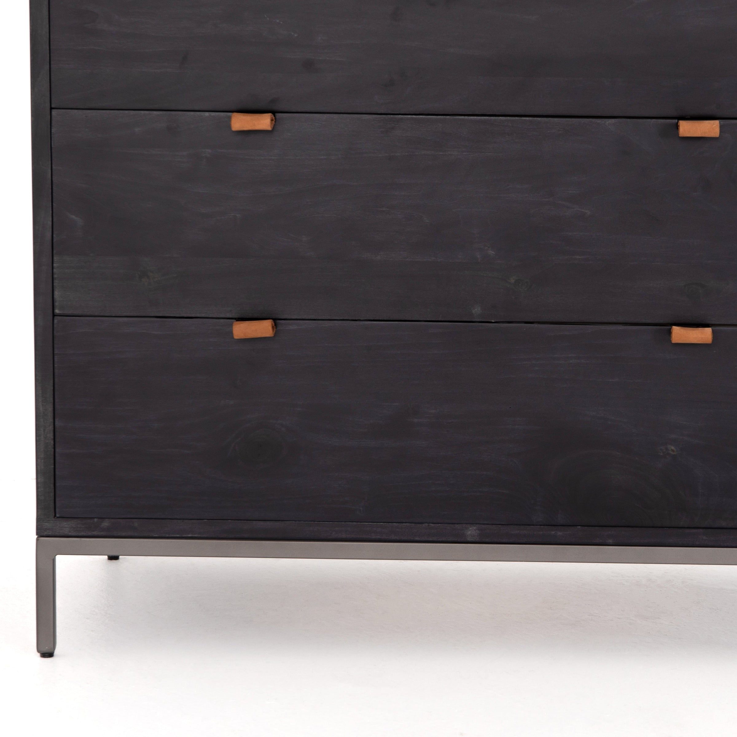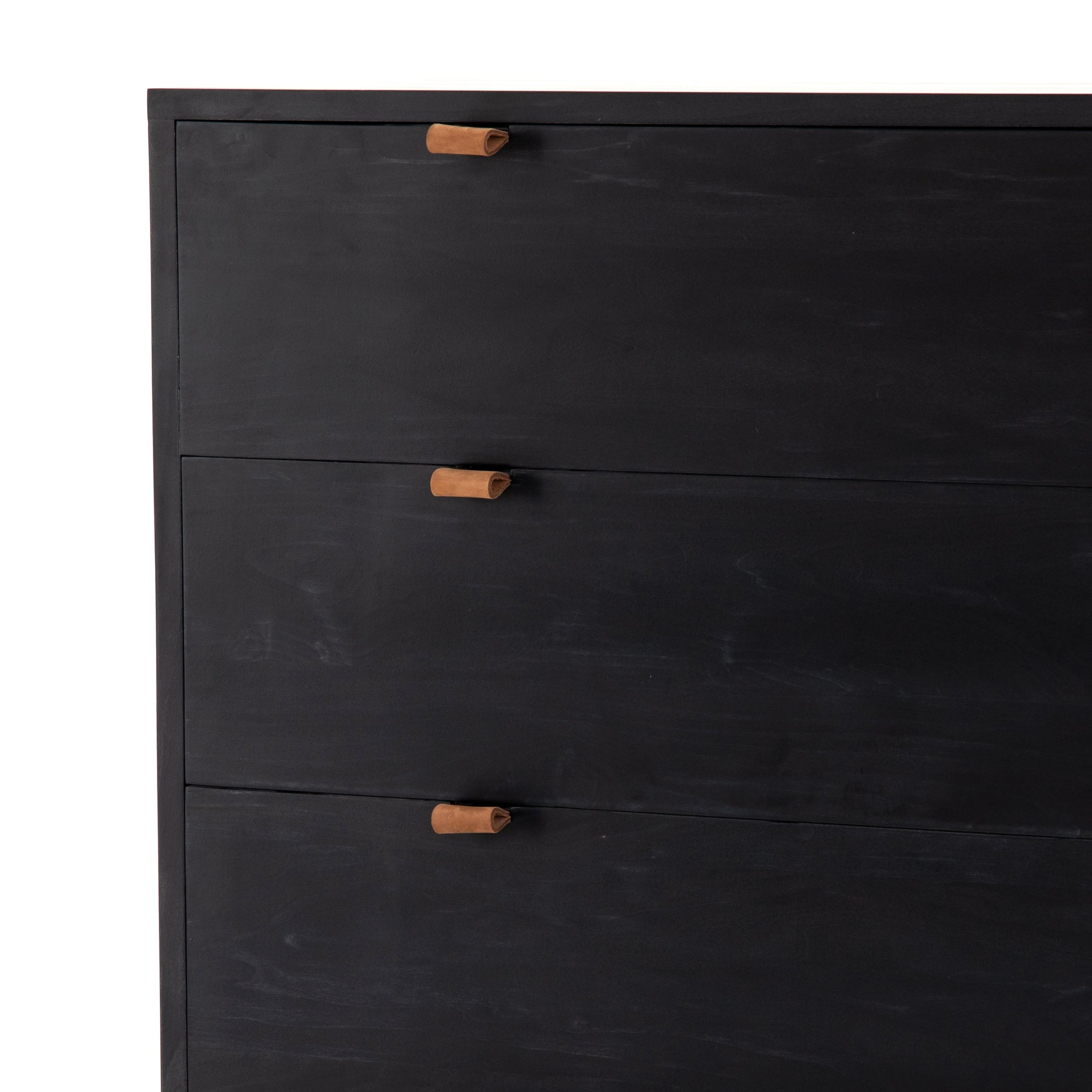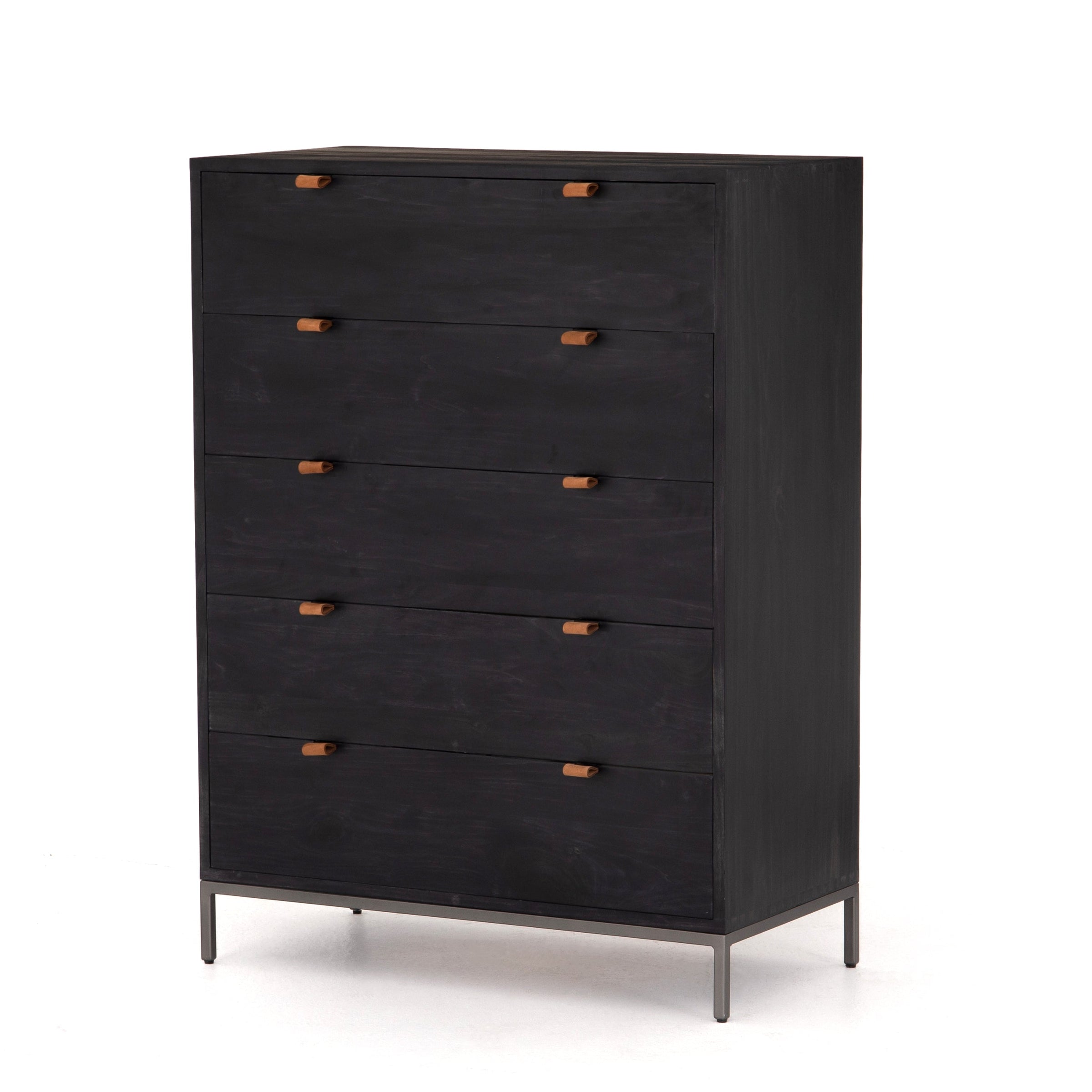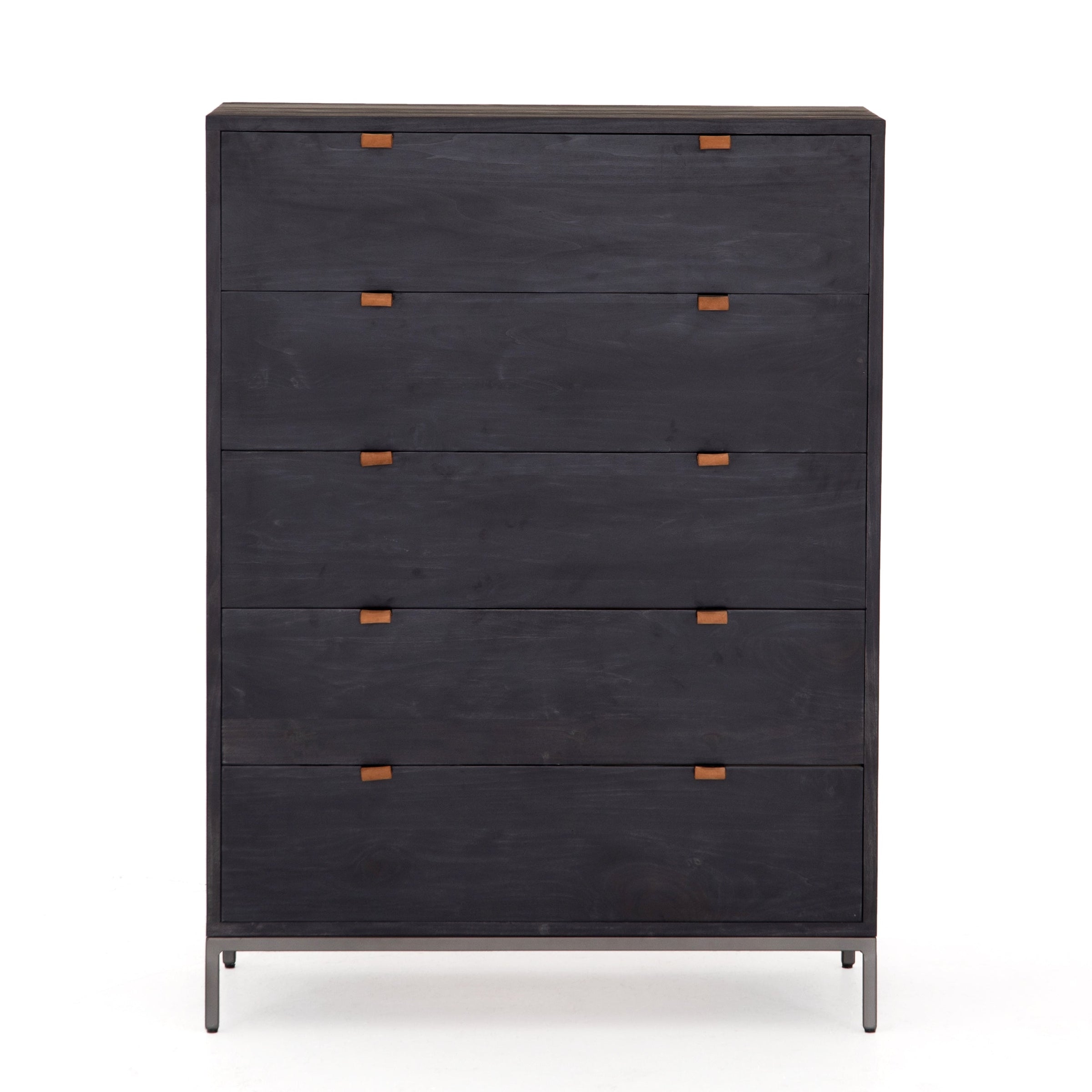 The toffee leather handles of this Trey 5 Drawer Dresser - Black Wash Poplar bring a classy pop of color and texture to the space. A stylish dresser of black-washed poplar offers plenty of bedroom storage space thanks to five spacious drawers.