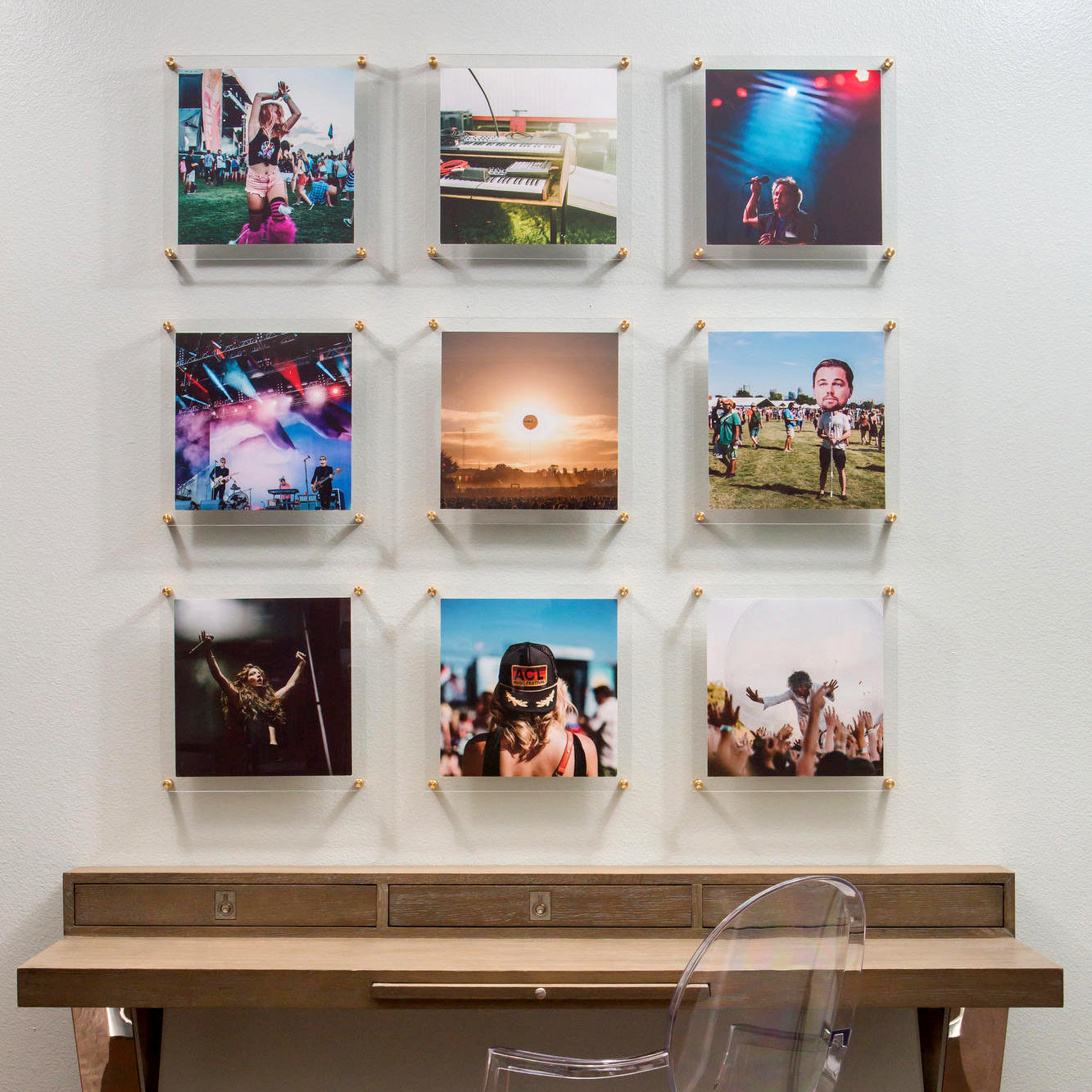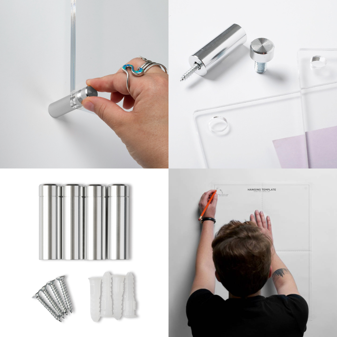 Each frame consists of two diamond-polished panels of acrylic that sandwich your art. When you want to change out your display, just unscrew the caps on the hardware and lift off the acrylic.