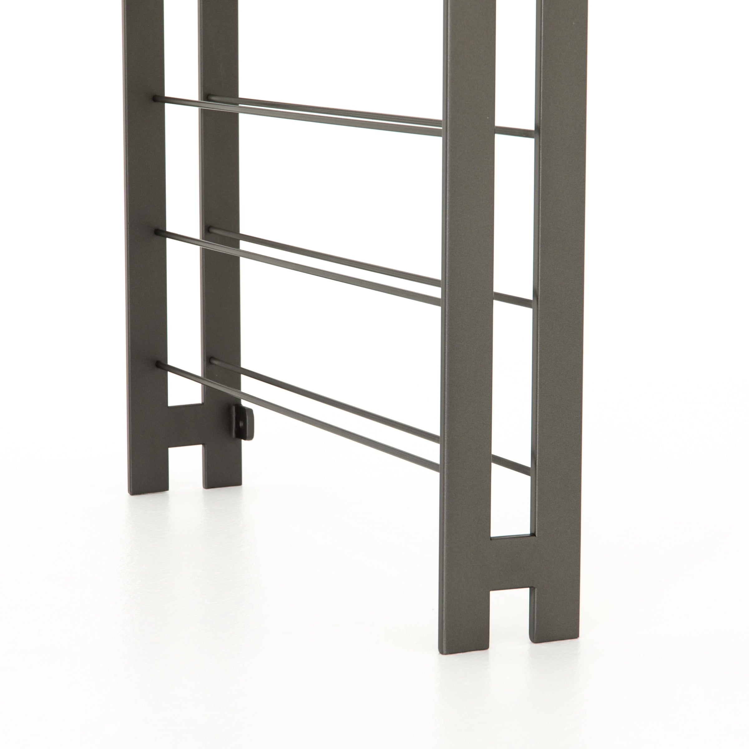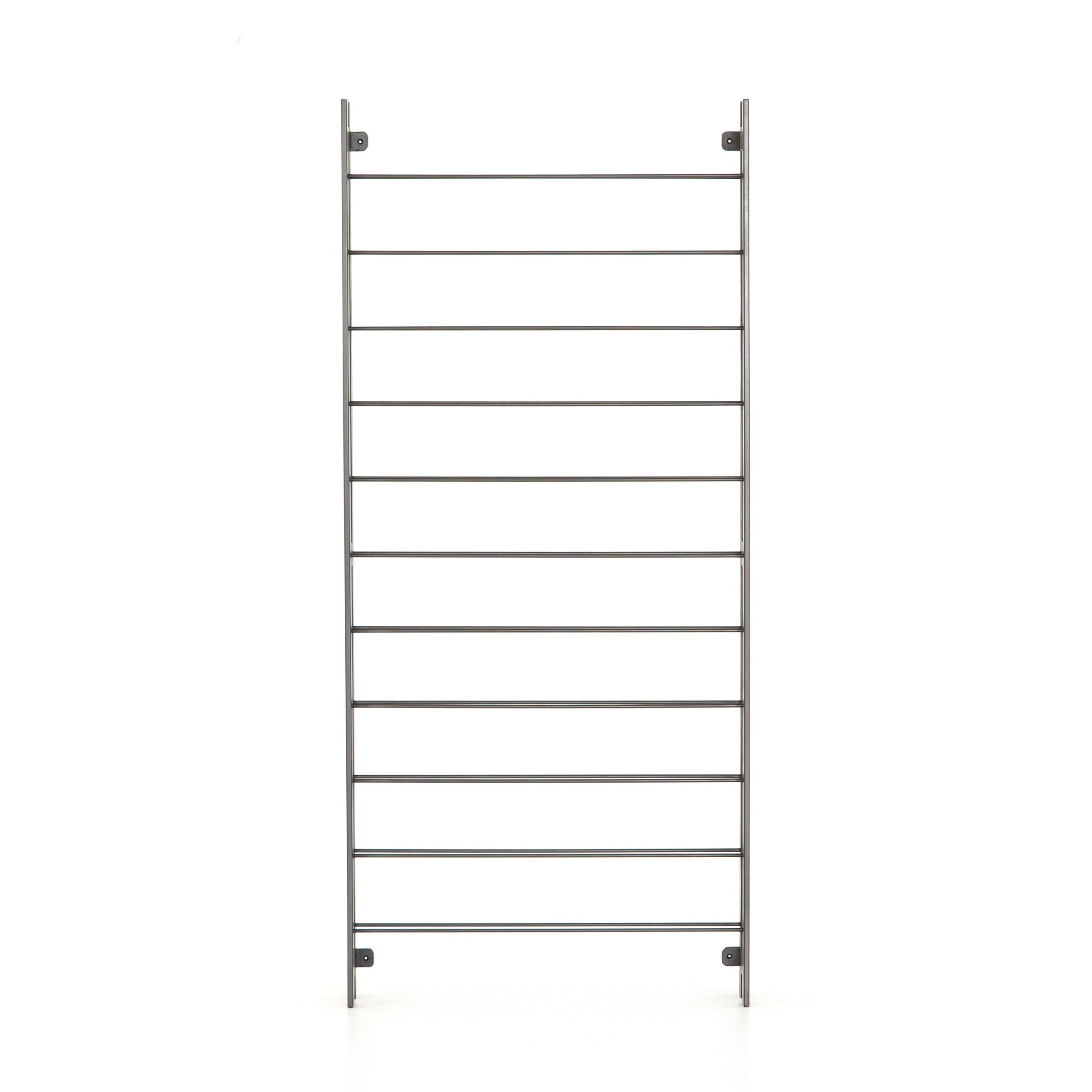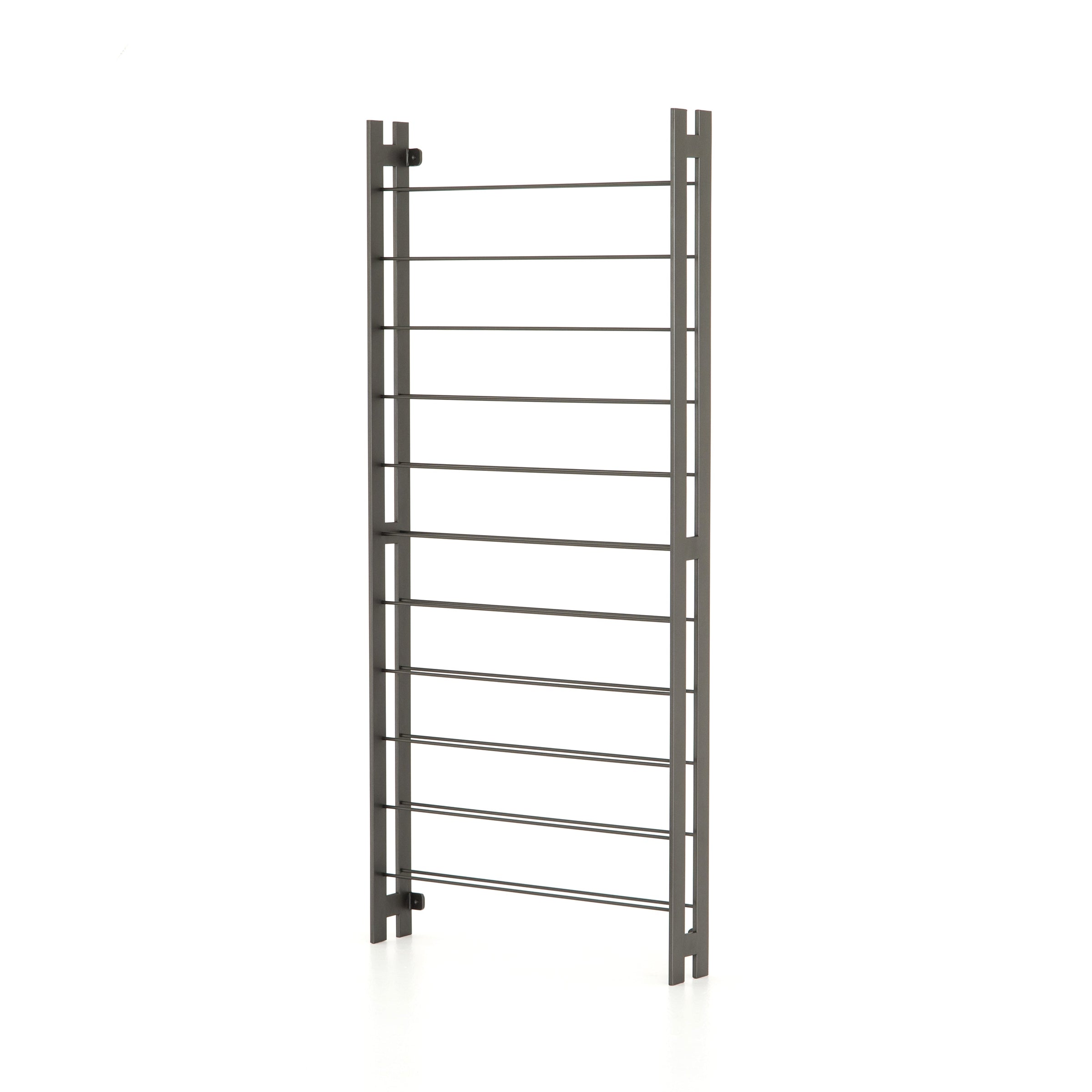 Store – and sip – in style. Tall, wall-mountable iron wine rack is finished in gunmetal, with open shelving for proper storage and stylish display of favorite wines. Anchors included.
