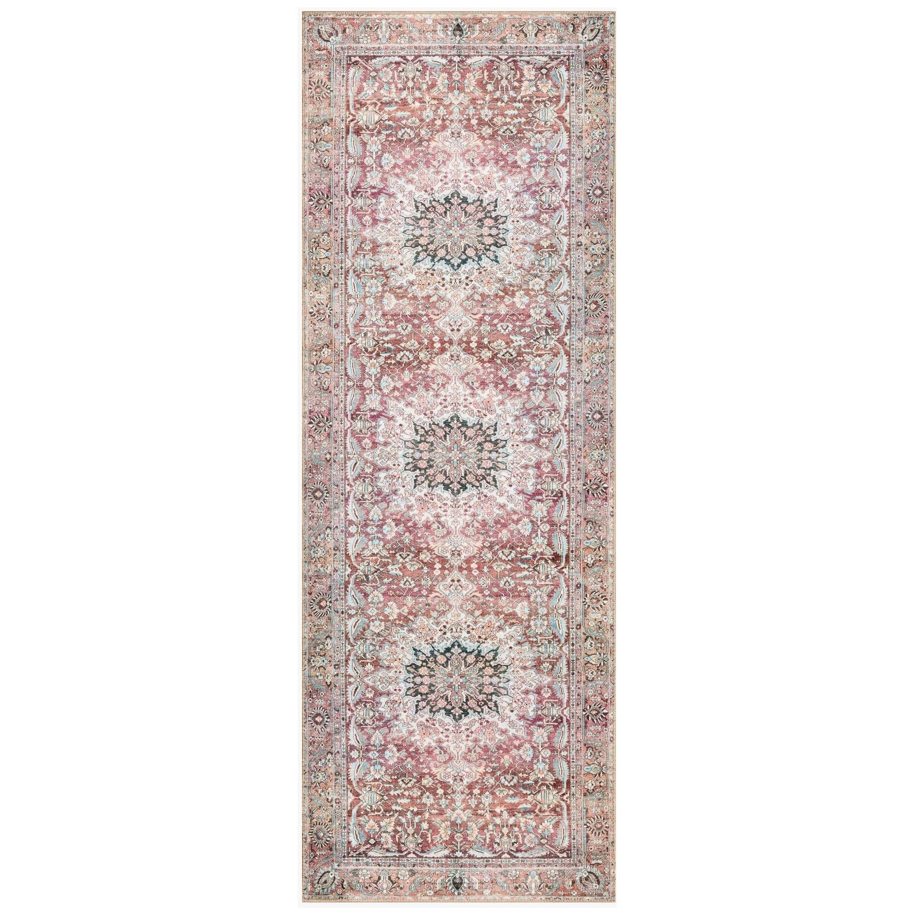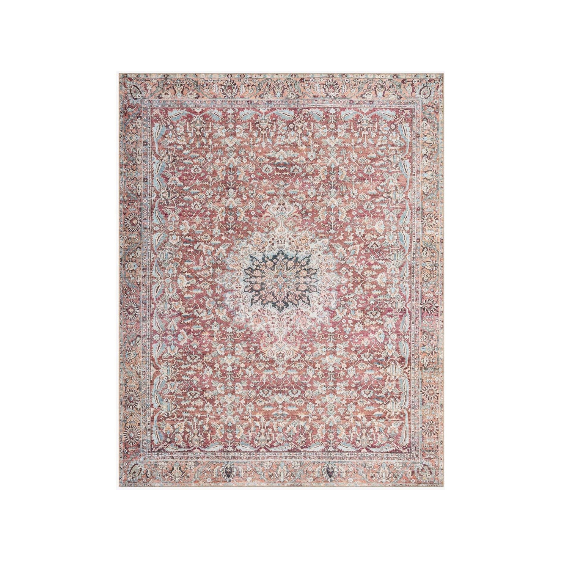 Old soul, new spirit. Power-loomed of 100% polyester, the Wynter Tomato / Teal area rug showcases a one-of-a-kind vintage or antique area rug look at an affordable price. This rug brings in tones of red, blue, orange, and hints of ivory, and ideal for high traffic areas due to the rug's durability. The rug is perfect for living rooms, dining rooms, kitchens, hallways, and entryways.